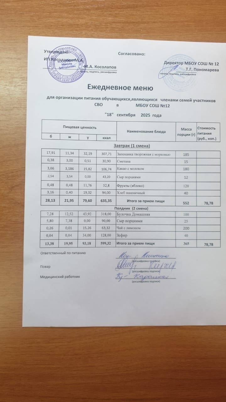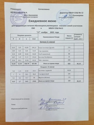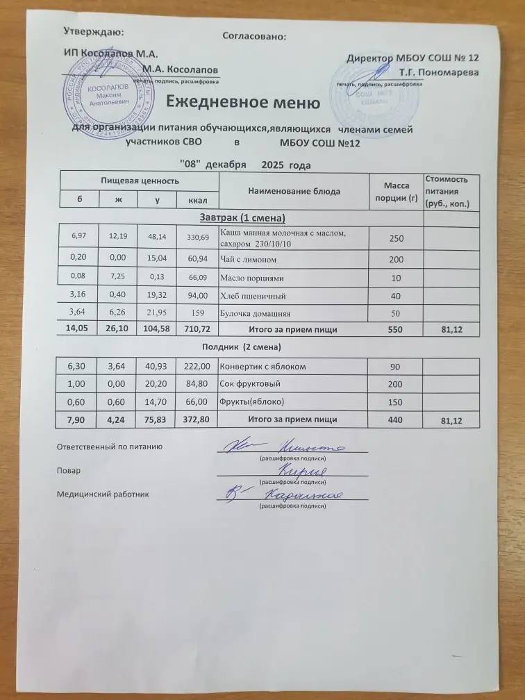 Примерное 2-х недельное меню для организации бесплатного горячего питания обучающихся, являющихся членами семей участников СВО в 5-11 классов (в 1-ю смену - завтрак, во 2-ю смену - полдник) в МБОУ СОШ №12 на 2025 год