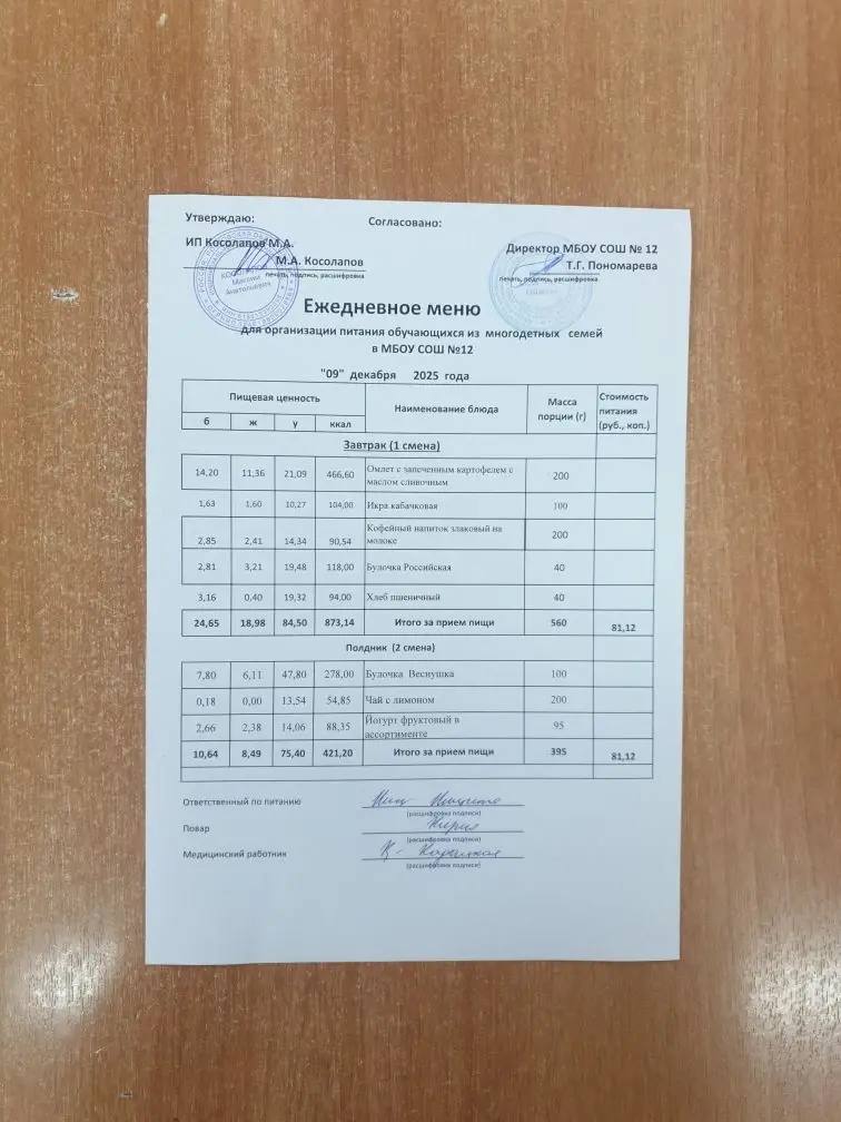 Примерное 2-х недельное меню для организации бесплатного горячего питания обучающихся из многодетных семей в 5-11 классах ( в 1-ю смену - завтрак, во 2-ю смену - полдник) в МБОУ СОШ №12 на 2025 год