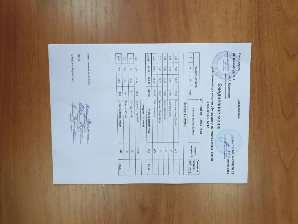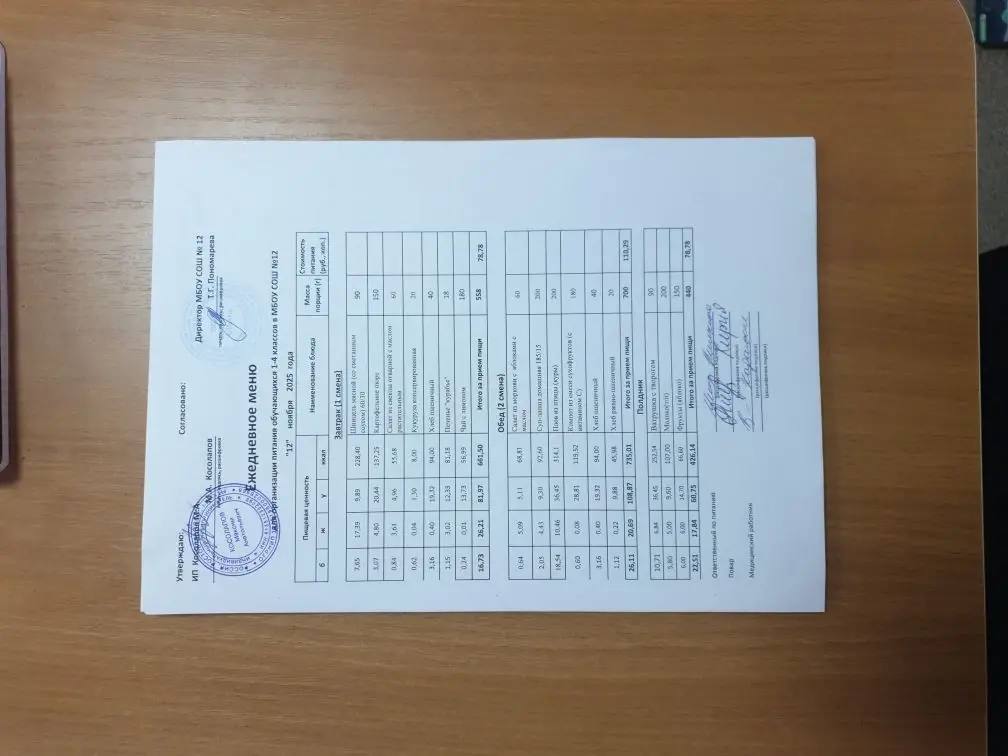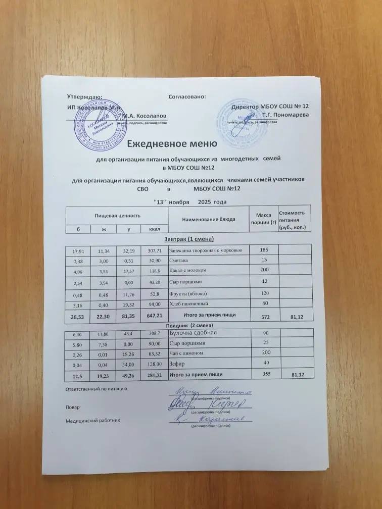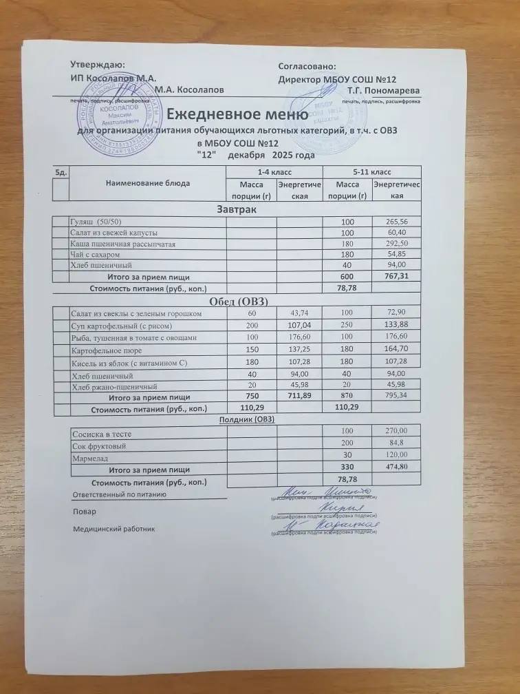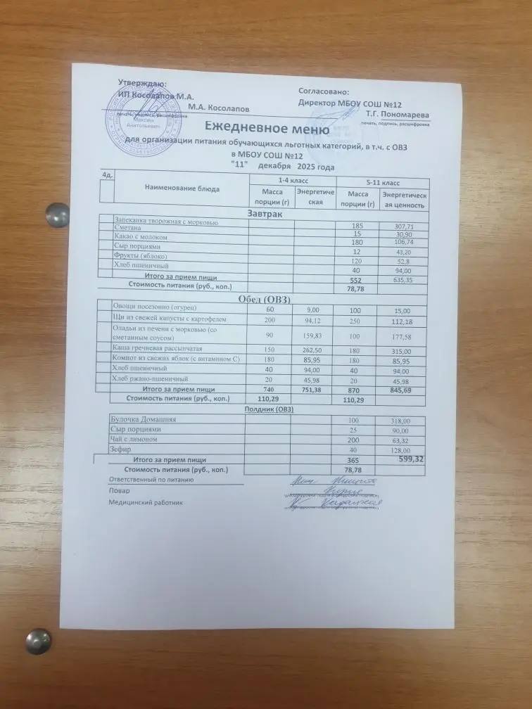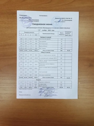 Примерное 2-х недельное меню для организации бесплатного горячего питания обучающихся льготных категорий в 5-11 классах (в 1-ю смену - завтраки), в т.ч. для обучающихся с ОВЗ (в 1-ю смену - завтрак и обед, во 2-ю - обед и полдник) в МБОУ СОШ №12 на 2025 год