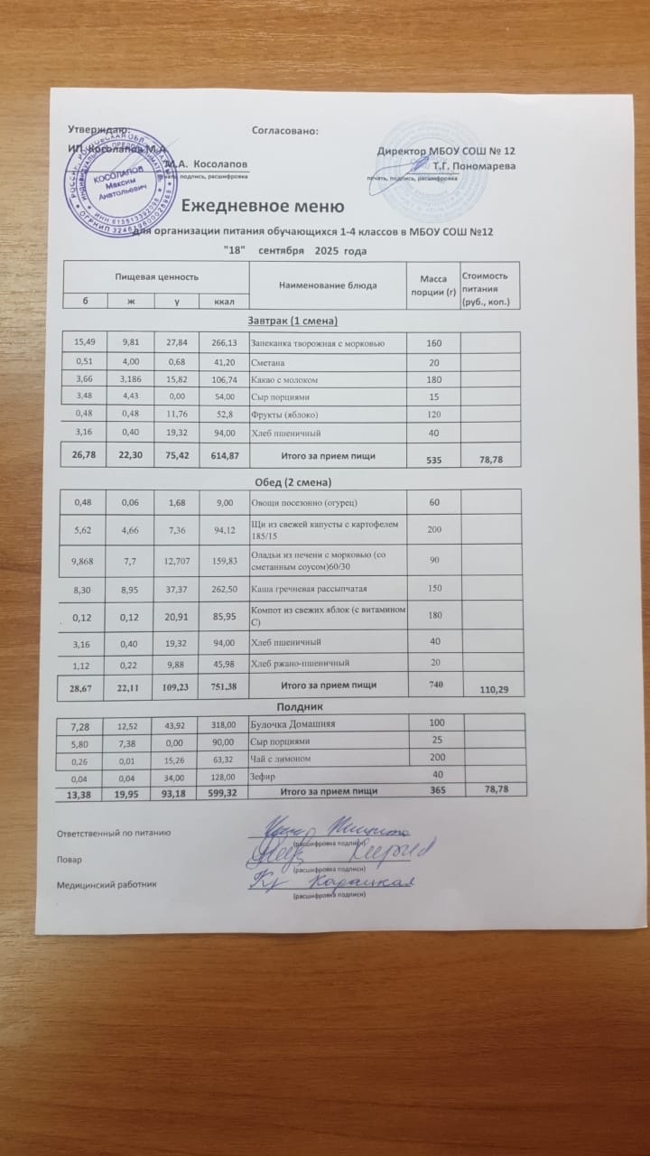 Примерное 2-х недельное меню для организации бесплатного горячего питания обучающихся в 1-4 классах ( во 2-ю смену - для ОВЗ полдник) в МБОУ СОШ №12 на 2025 год