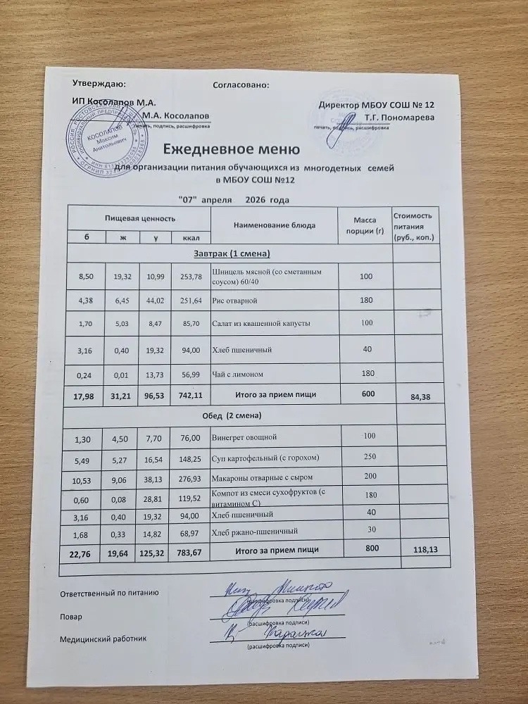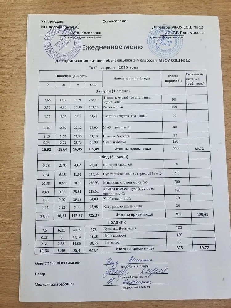 - один раз в день — дети-инвалиды, дети из многодетных семей, дети из семей участников СВО, дети из семей, находящихся в социально опасных условиях и состоящих на учете в муниципальном банке данных, обучающиеся 1-4 классов согласно меню, утвержденному исполнителем услуг, согласованному руководителем образовательной организации, руководителем Департамента образования г. Шахты;
